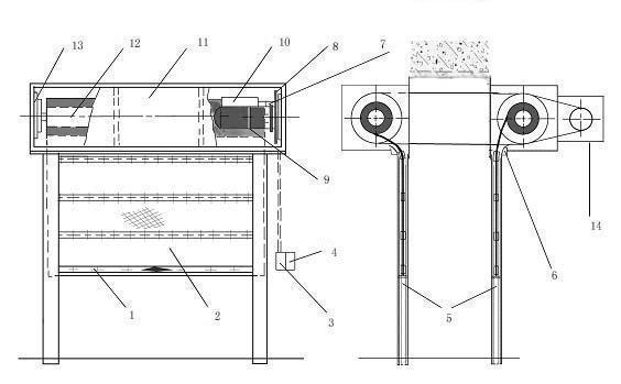 (1)座板; (2)簾板; (3)按鈕開關(guān); (4)手動速放裝置; (5)導(dǎo)軌; (6)門楣; (7)限位器; (8)鏈輪; (9)卷門機; (10)控制箱; (11)箱體; (12)卷軸; (13)支座 (14)電機