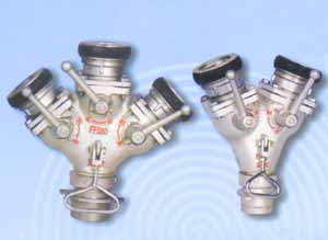 分水器裝置于水帶干線上; 每一個分水器有一個進水口和幾個出水口,可以同時
