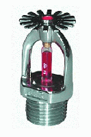 下垂型噴頭是由噴頭框架、溫感元件、密封件、濺水盤等組成,其中噴頭框架是采用銅合金材質的精密鍛壓、外表層進行鍍鉻拋光的制造工藝,使其具有框架強度高、耐腐蝕性強、外觀精美的特點。溫感元件(玻璃球)具有動作可靠,反應速度快。密封件具有抗老化、耐腐蝕、密封性好的性能特點。下垂型噴頭向下噴灑的水量為80%~100%。玻璃球的直徑為5mm[RTI 大于50(m·s)0.5且小于等于80(m·s)0.5]。依據玻璃球動作的溫度不同而分為多種溫級噴頭。