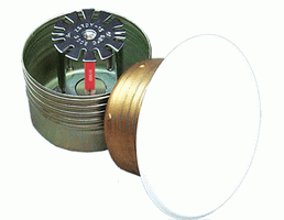 隱蔽式噴頭是由噴頭框架、溫感元件、裝飾片、支架、底托支架、密封件、濺水盤等組成,其中噴頭框架是采用銅合金材質的精密鍛壓、外表層進行鍍鉻拋光的制造工藝,使其具有框架強度高、耐腐蝕性強、外觀精美的特點。溫感元件(玻璃球)具有動作可靠,反應速度快。密封元件具有抗老化、耐腐蝕、密封性好的性能特點。隱蔽式噴頭玻璃球的直徑為5mm[RTI 大于50(m·s)0.5且小于等于80(m·s)0.5]。或3mm[RTI≤50(m·s)0.5],裝飾片與支架采用低熔點焊錫焊接(熔化溫度61℃±1℃)。將噴頭全部隱蔽在裝飾罩內。當火災發生時,裝飾片與支架之間的低熔點焊接金屬首先熔化,裝飾片脫落。當玻璃球溫度達到動作溫度時,玻璃球爆破,噴頭噴水滅火。